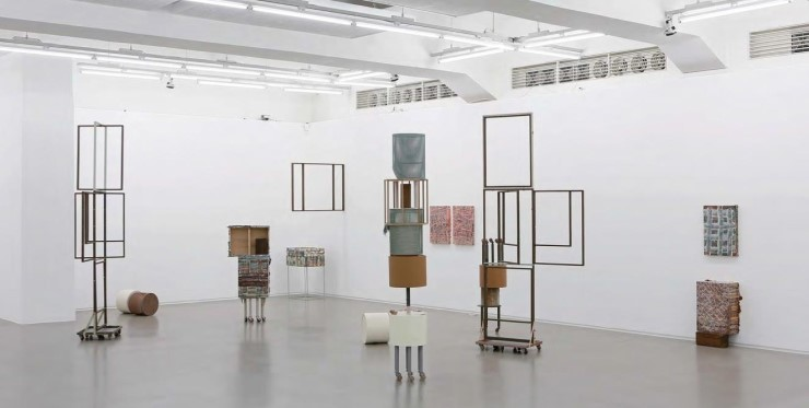 The basic construction principle of Kang’s paintings and compositions of frames also started to spread to sculpture and corresponding ambiances, which could all be seen as spatial extensions of the artist’s initial working surface. The rectangular elements of Kang’s paintings became translated into sequences of individual objects integrated into various, predominantly vertical sculptural entities. In her earlier body of work including Grandmother Tower series, the artist started with common steel or wooden objects found at flea markets or on the streets, feckless and often defective, which were initially chosen because of their geometrical, abstract shapes. However, often they get distorted and become unrecognizable through their fusions and the artist’s subtle interventions. In these as well as in more recent works, Kang’s action is also inscribed in the form of tight weaving of yarns around the edges of objects. This is not only a practical invention for gaining basic stability on the junctions, as objects are simply but carefully piled on top of each other stunningly defying gravity, but also a visible inscription of the artist’s labor - continual activity corresponding to the meditative recurrent movements of the artist’s hand and body while painting. Also, there is a characteristic softness of the thread contrasting the objects’ sharp industrial properties, equally present through the colors of the strings that often resemble subtle tones of her paintings.